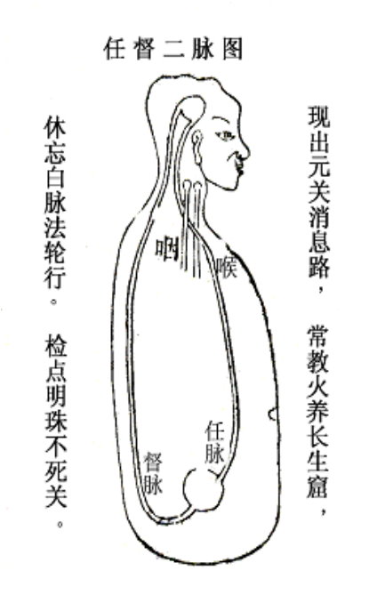 蓋此圖與前二圖原是一也,所重續者,何為?是恐修道之人,不知自身有法輪之路道,故備此圖,以曉同志耳!蓋人能通此二脈,則百脈俱通矣。所以鹿之睡時,鼻入肛門,通其督脈;鶴龜通其任脈;三物俱有千歲之壽,何況人乎!修道之士,既轉法輪,以運慧命,何患不長其壽,而成其道也。