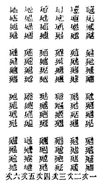 有八十四篆。神母布之,皇人摹之,谌母订之,旌阳集之,果老阐之,纯阳用之,泥丸袭之,一炳承之。我师泥丸氏曰:太素云篆,散布太虚,一时之胜因,皇人天真,见而摹之藏诸天府,授诸世真。譬犹一斛牟尼,散盛(音成)人世,并无句读(音豆),亦无音韵可稽,旌阳集得而慨曰:散寿无方,寿难圆寿。兼之篆体离奇,摹仿真非易也,谌母因而感降,为授音韵,使人可读。旌阳领之,从而翻译成楷,随更集而成文,始有大洞玉经之名。然犹未辑入藏者,延至刘宋,乌程陆静修,奉诏辑入。余按世用,盖有用 ④ ,而统将译楷,逐字分砌钩中,均有玄义存焉者。吕祖医科,独取玩包,稽谓元始玉法为尔,乃即篆集经文南无珏法句义也。我师又曰:物物有自而生者。云篆之生,生自金书。金书之现,现在王倪。王倪惟何,元命是也。学如假究,是为穷源。知而谨运,化化生生,不违道体。要知道本太虚,体本至无。此义一明,虚无二字,又为王倪所自出也矣。此之谓澈,学者凛体毋忽。以下十二篆,吕祖所续,然其玄义,可度而测者。